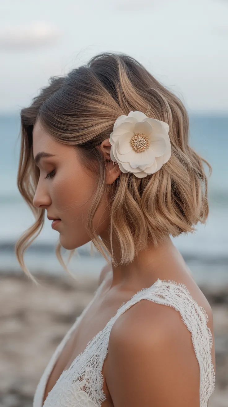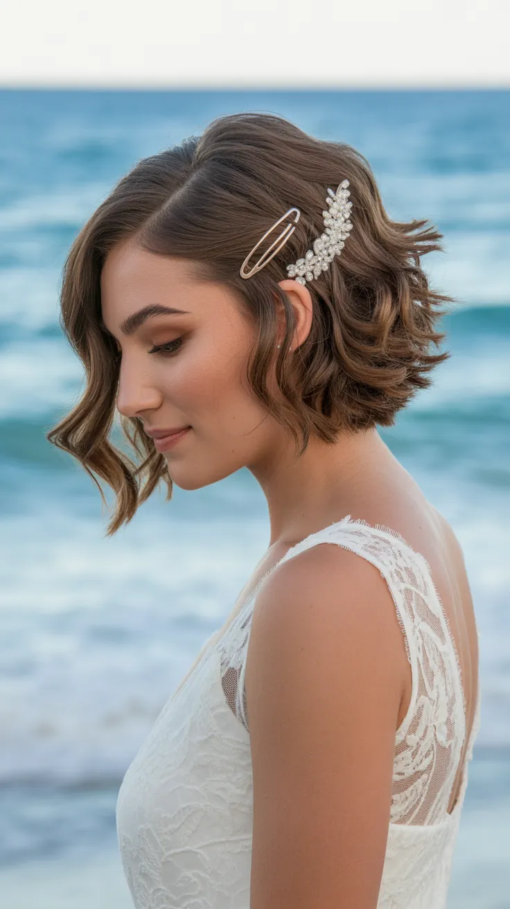 Short hair can be stunning for a beach wedding, especially when styled with soft waves. This look is effortless yet romantic, perfect for a seaside ceremony. The gentle waves add a touch of playfulness, making it ideal for a relaxed atmosphere.