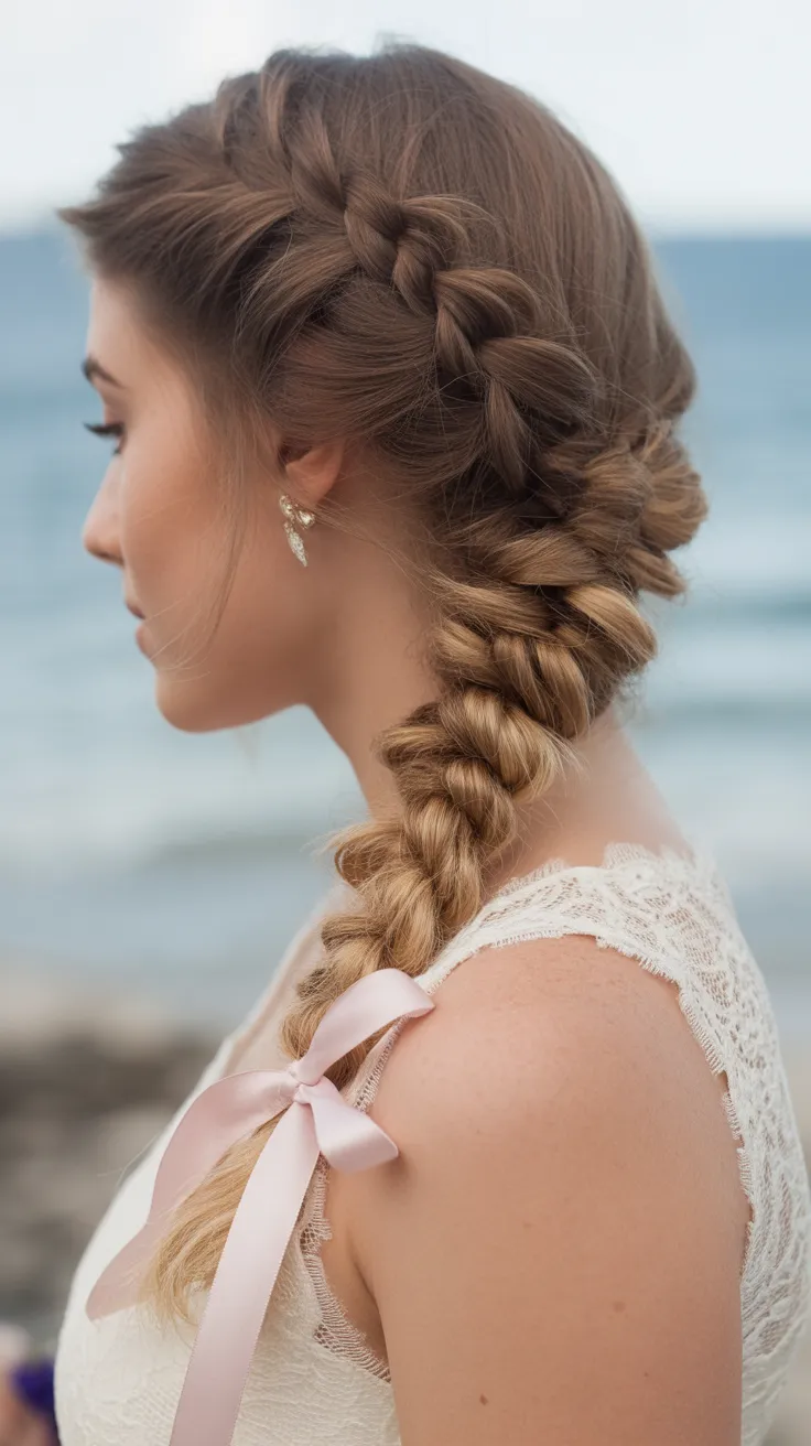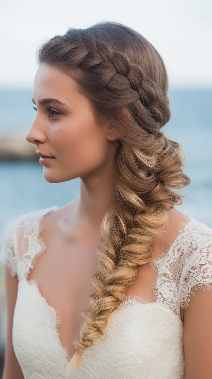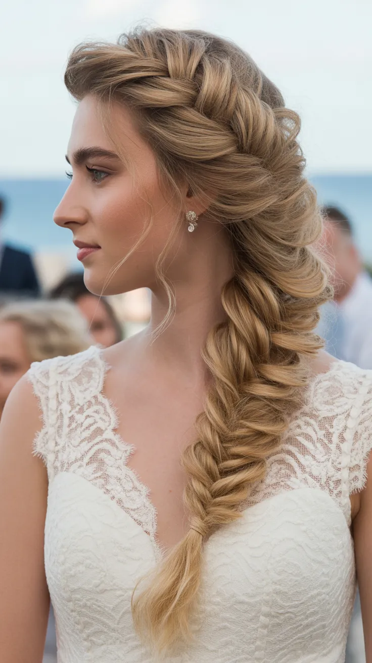 The side-swept fishtail braid is a stunning choice for a beach wedding. This hairstyle combines elegance with a relaxed vibe, making it perfect for a seaside ceremony. The braid drapes beautifully over one shoulder, allowing for a soft and romantic look.