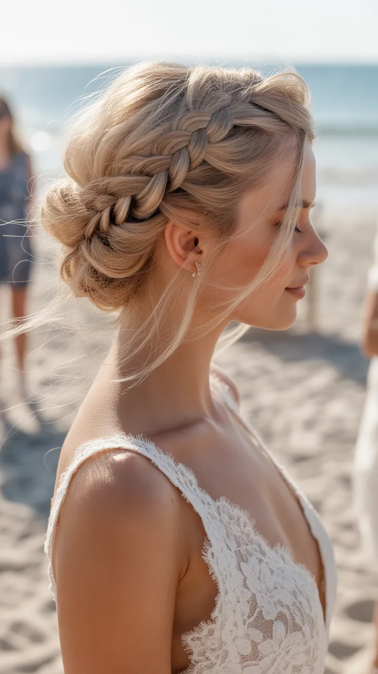 The twisted crown hairstyle is a stunning choice for a beach wedding. This look combines elegance with a relaxed vibe, perfect for a seaside ceremony. The intricate braids wrap around the head, creating a halo effect that frames the face beautifully.