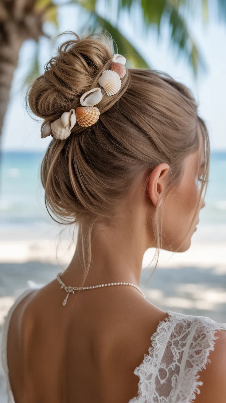 Whether you opt for a floral halo or a halo braid, this hairstyle can be adapted to fit your personal style. The messy bun with loose tendrils and shells is a delightful choice for any beach wedding.