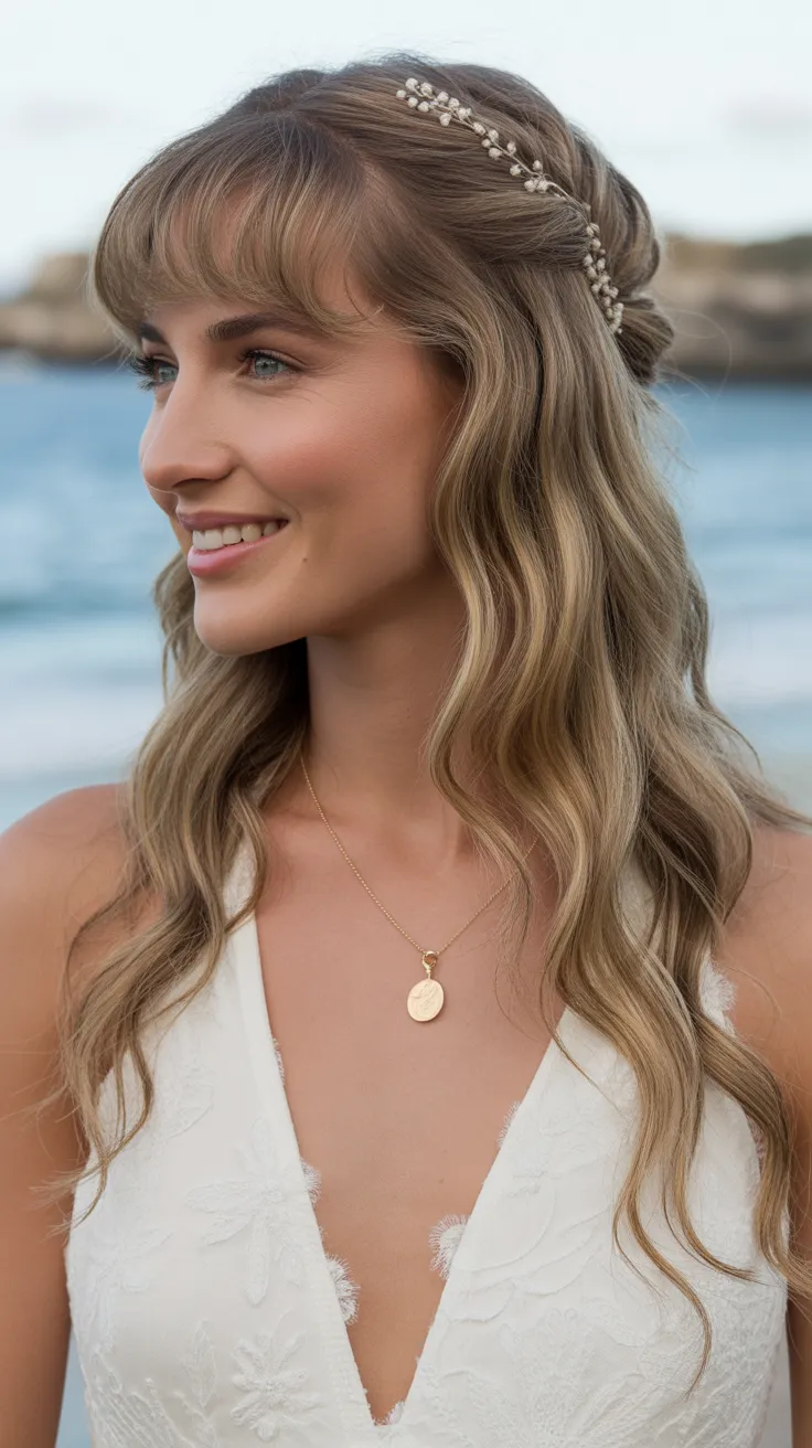 This half-up beach hair look is perfect for a romantic beach wedding. The wavy curtain bangs frame the face beautifully, adding a soft touch to the overall style. This hairstyle combines elegance with a relaxed vibe, making it ideal for a seaside celebration.