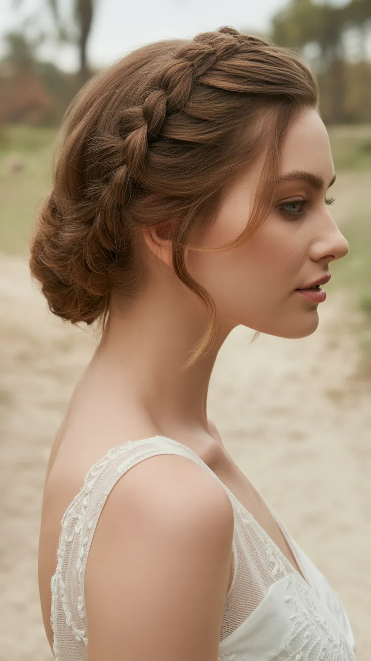 This stunning braided bun is perfect for a beach wedding. The intricate braid wraps elegantly around the bun, giving it a romantic and effortless look. The soft waves framing the face add a touch of softness, making it ideal for a seaside celebration.