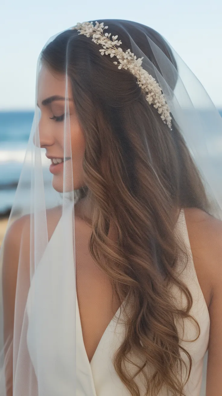 Adding a sheer veil underneath enhances the look, creating a dreamy effect. The veil gently frames the face, adding a touch of whimsy without overwhelming the natural waves. This combination is ideal for brides who want to keep their hair down while still looking polished.