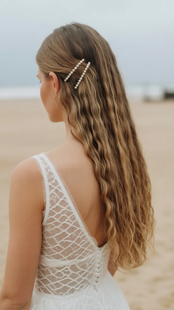 This hairstyle works well with a floral halo or can stand alone as a simple beachy updo. It’s versatile and can be styled to fit any wedding theme. Whether you’re going for a casual beach ceremony or a more formal affair, long beach waves with pearl clips are a perfect match.