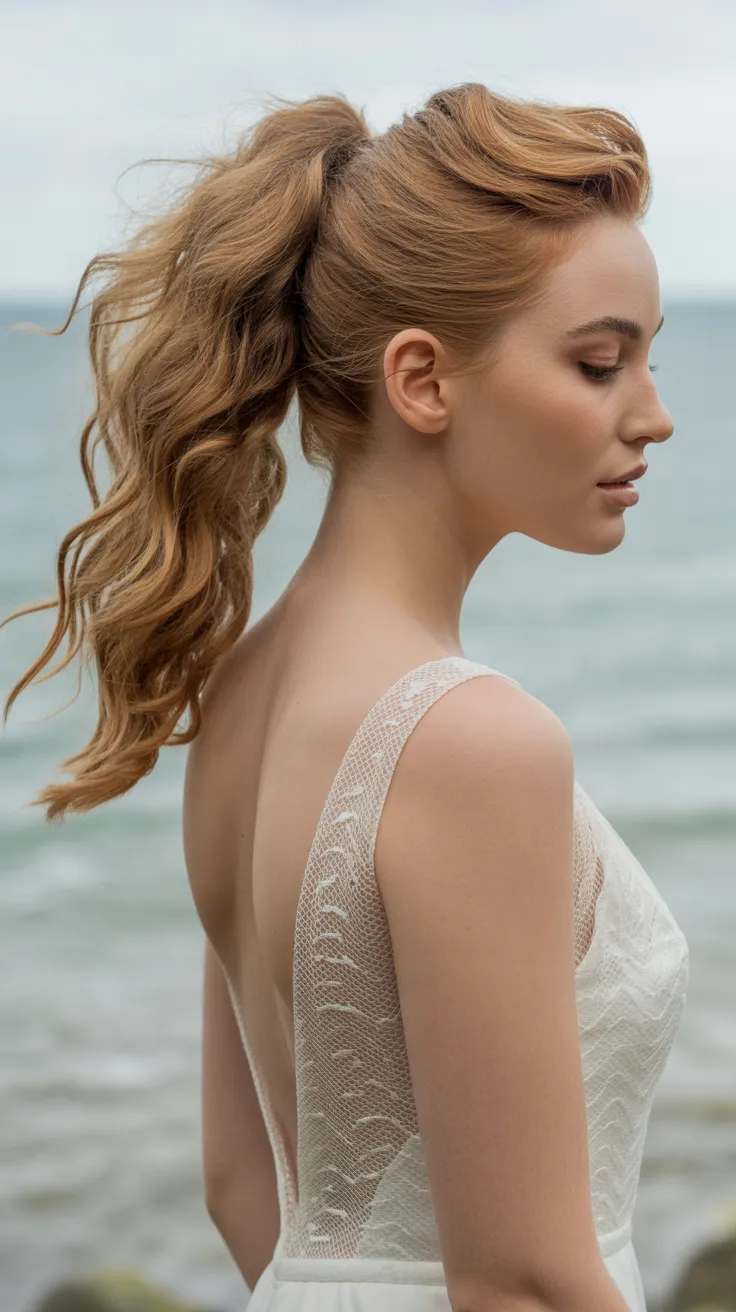 The high beachy ponytail is a stunning choice for a beach wedding. This hairstyle combines elegance with a relaxed vibe, making it perfect for a seaside ceremony. The wind-swept texture adds a playful touch, ideal for those breezy beach days.
