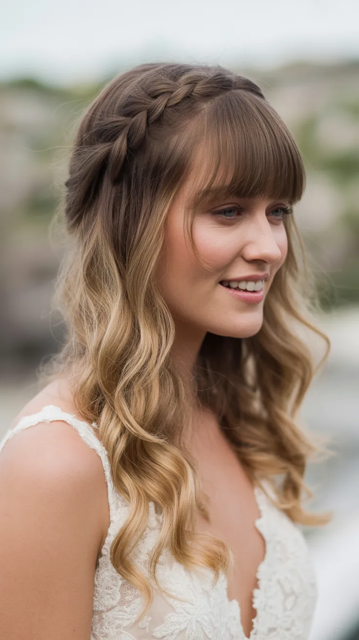 Loose waves paired with braided bangs create a stunning look for a beach wedding. This style is both romantic and practical, perfect for a breezy seaside setting. The soft waves cascade beautifully, while the braided bangs add a touch of elegance.