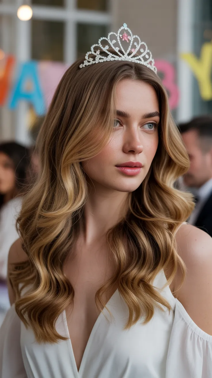 14. Long Soft Waves Hair With Birthday Tiara