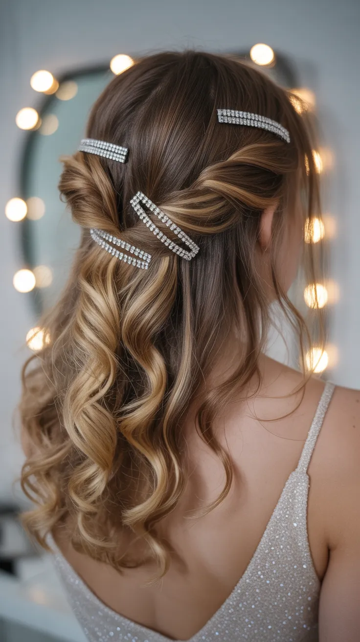 3. Half-Up Curls Hair With Rhinestone Clips