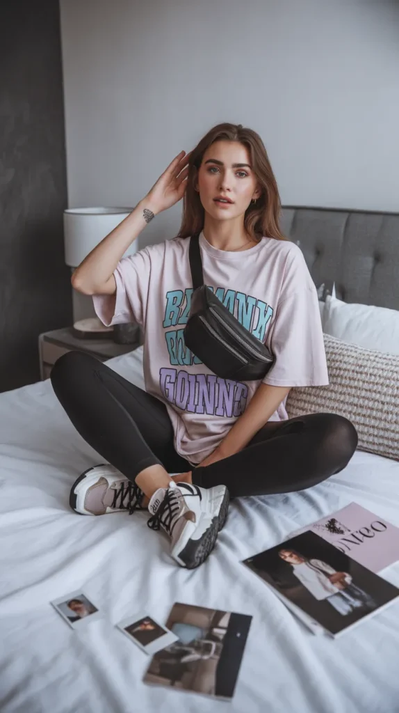 This one’s the ultimate chill girl uniform. Black leggings + an oversized pastel graphic tee + chunky sneakers = instant comfort and style. Toss in a crossbody fanny pack, and suddenly you’ve got a cute outfit that feels casual yet put-together. It’s perfect for errands, brunch, or even just hanging with friends. Ever notice how oversized tops balance leggings so well? Yeah, this combo just works every single time.