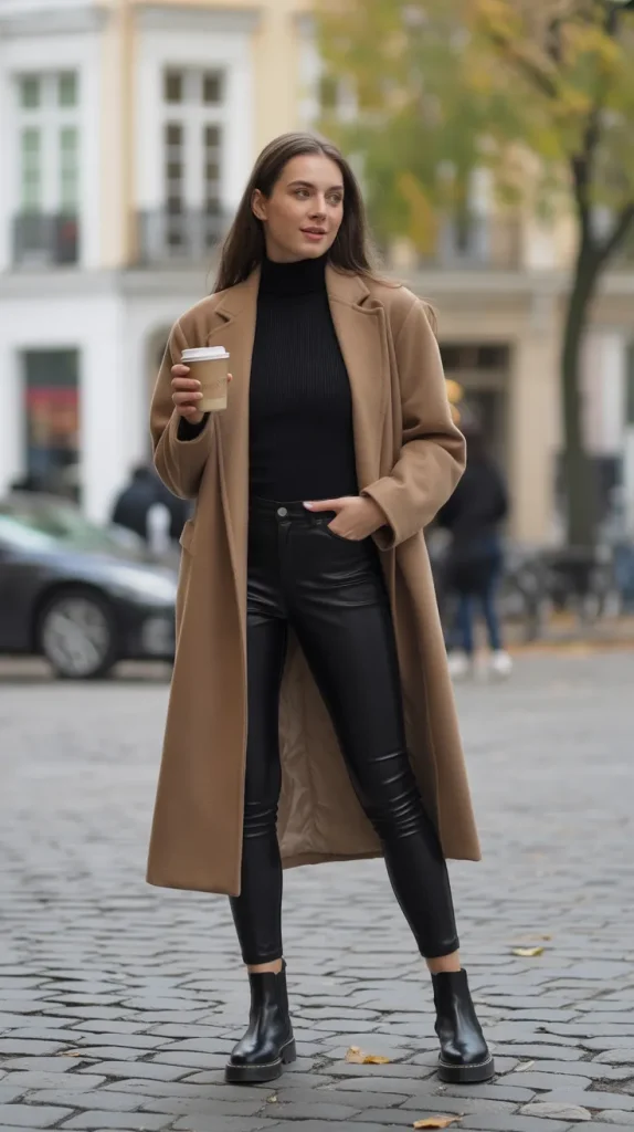 Cold weather doesn’t mean boring. Black leggings, a fitted turtleneck, and a camel longline coat scream elegante casual winter energy. Chelsea boots tie it all together for a sleek finish. It’s warm, stylish, and perfect for city strolls or outdoor coffee dates. Honestly, this look proves leggings deserve a spot in your winter wardrobe.