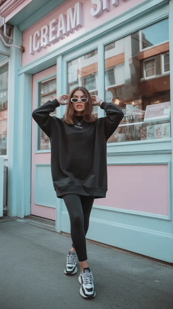16. Black Leggings with Oversized Sweatshirt Dress 👗