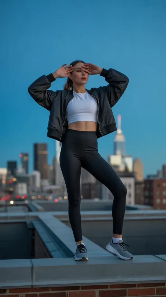 Last but not least, sporty street style at its best. Black leggings with a white crop top, cropped bomber jacket, and running shoes create a cool, energetic vibe. It’s perfect for travel days, casual outings, or even coffee runs. The bomber gives structure while leggings keep it sleek. Honestly, this outfit feels like off-duty celeb inspo in the best way.
