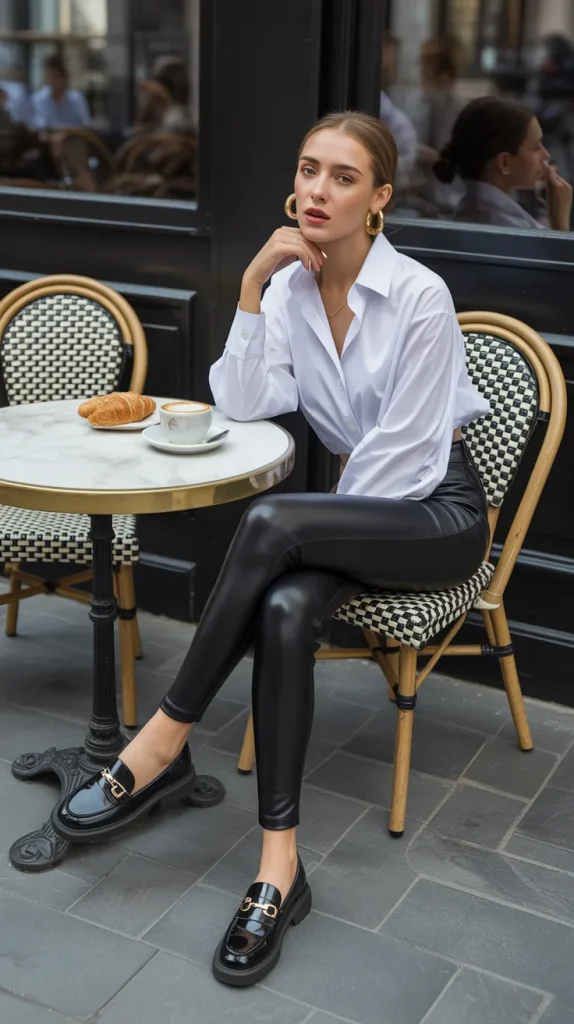This is elegance without effort. Black leggings with a crisp oversized white button-up and loafers scream elegante casual vibes. Gold hoop earrings elevate the whole look, taking it from basic to polished in seconds. It’s one of those outfits with leggings you can wear to casual Fridays at work, then straight to dinner. Ever want to look like you planned your outfit, even if you didn’t? This one nails it.