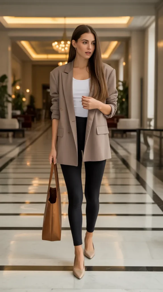 For instant sophistication, throw an oversized taupe blazer over your black leggings. Add a simple white tank, pointed flats, and a leather tote. The result? Elegante casual vibes that work for meetings, lunch dates, or city days. This is proof that outfits with leggings can look just as polished as trousers. Honestly, it’s low effort with maximum impact.