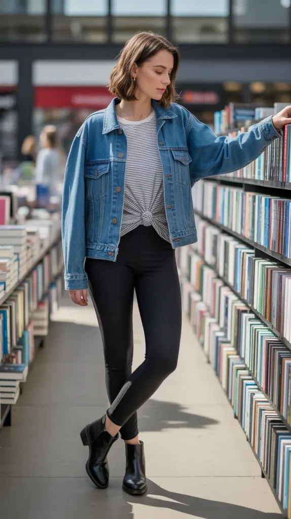 You can’t go wrong with denim. Black leggings, a tucked-in striped tee, and a blue denim jacket create instant casual cute outfit vibes. Add ankle boots, and suddenly it’s street-style ready. This look is timeless, comfy, and oh-so versatile. Perfect for weekends when you want to keep things easy but stylish.