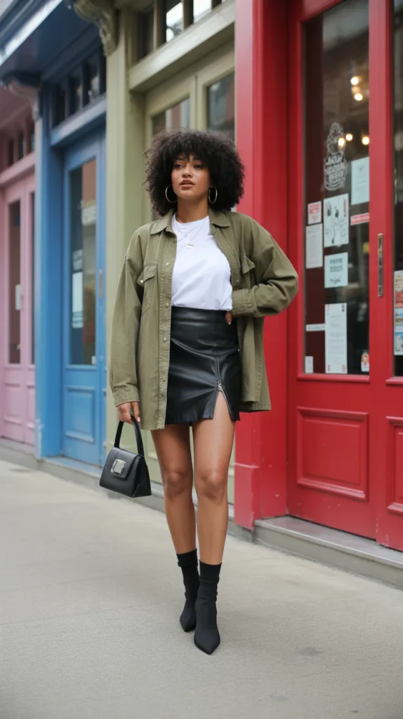 This combo feels modern, bold, and beautifully balanced for Black women. The olive jacket adds structure, while the leather mini keeps the outfit sharp. Add hoop earrings, sock boots, and a structured handbag to complete this confident chic moment.