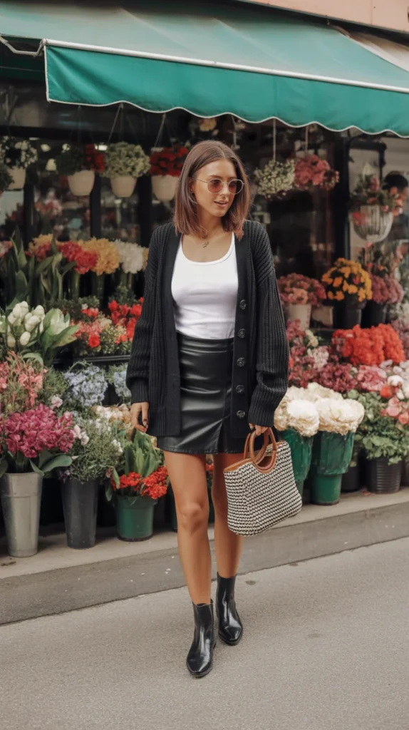 If you want a little edge, this is the one. A graphic tee keeps things casual, while the leather jacket and leather skirt combo adds bold personality. Combat boots and a crossbody bag make the whole look feel confident and unfussy.