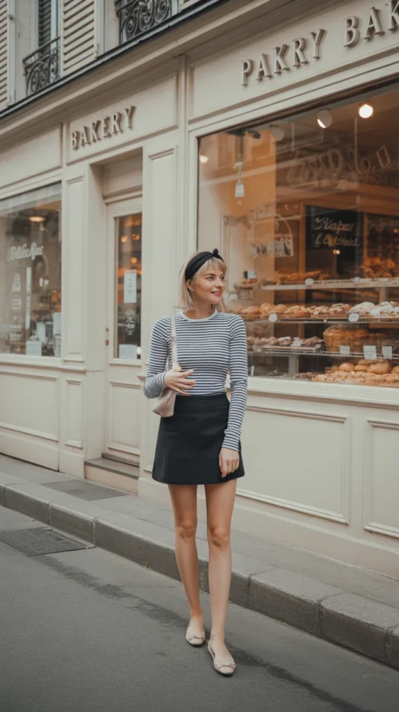 This look has a cute French-inspired charm that always feels timeless. A striped top keeps things classic while ballet flats add feminine polish. A black headband and minimal jewelry tie the look together without overdoing it.