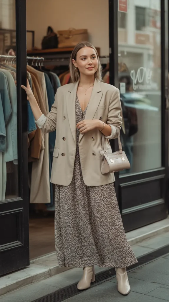 For an effortless casual style outfit, layer a soft beige blazer over a printed maxi dress. Add ankle boots for an instant autumn vibe.
