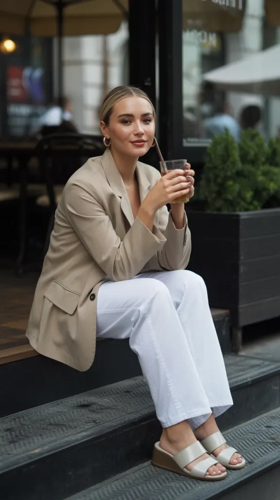For breezy chic, pair a beige blazer with loose white pants and sandals. A clean and minimal look that always works.