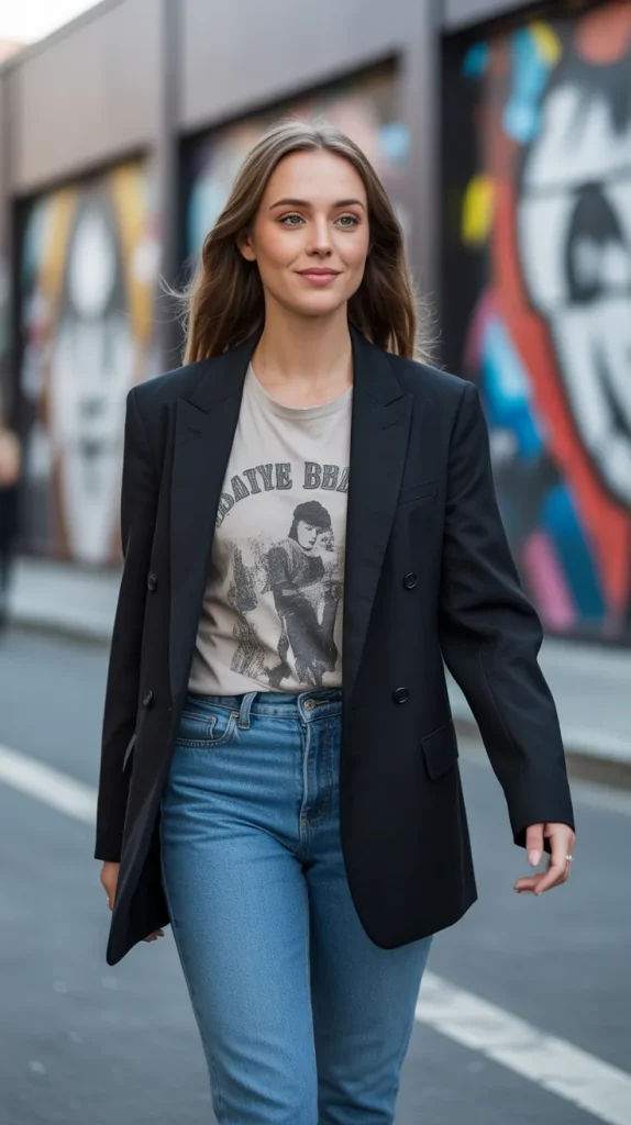 Edgy meets polished when you pair a black blazer with a vintage graphic tee, skinny jeans, and ankle boots. Perfect for casual nights out.