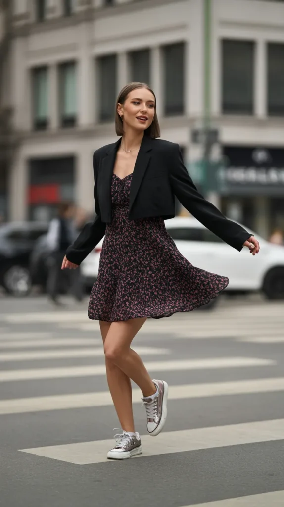 Style a cropped black blazer over a floral mini dress with white sneakers for youthful charm that feels playful yet chic.