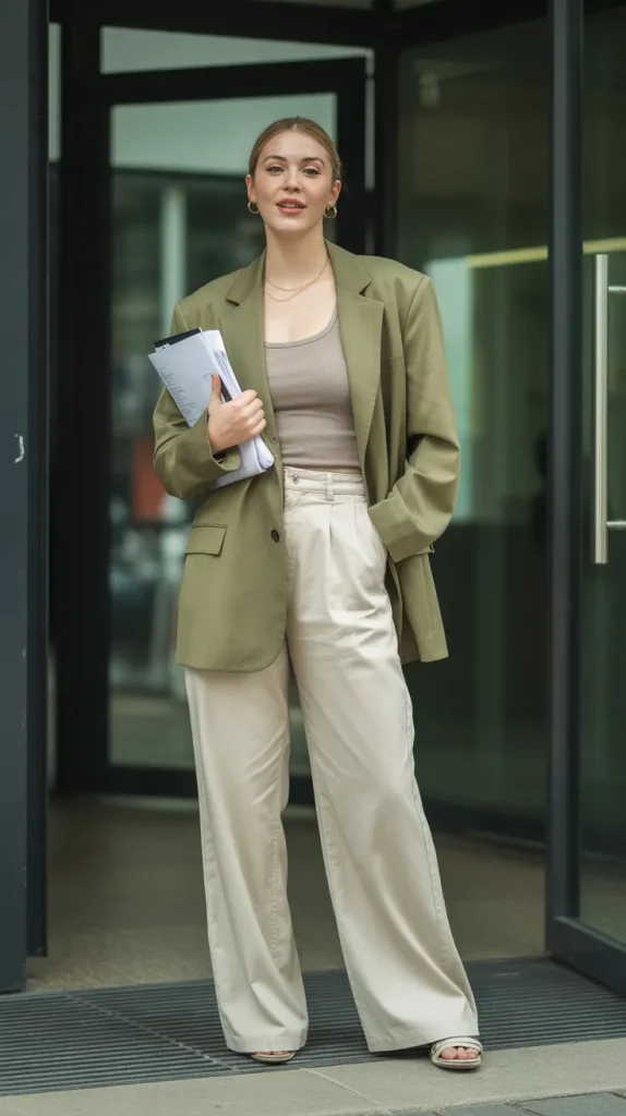 Go relaxed and stylish with a khaki blazer, cream wide-leg trousers, and a tucked-in tank. A soft balance of comfort and structure.
