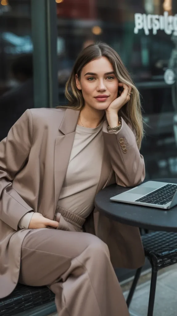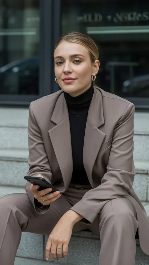 Balance comfort and structure with a taupe oversized blazer, fitted turtleneck, and slim trousers. This look is elegant casual at its best relaxed yet refined.