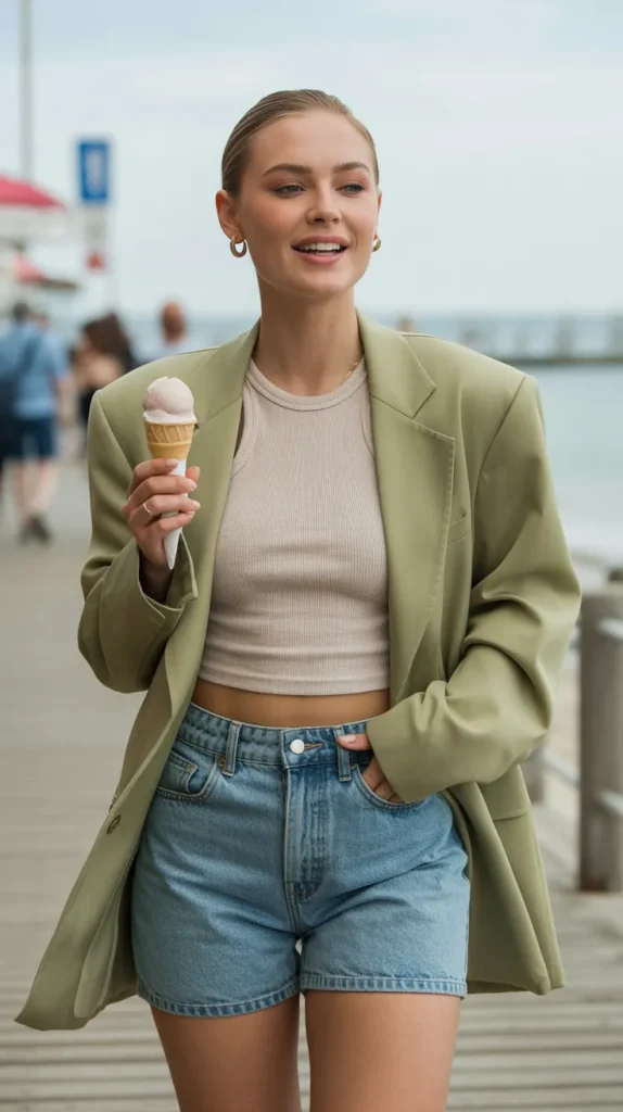 A fitted black blazer paired with tailored shorts and loafers gives polished ease while still keeping the casual energy alive.