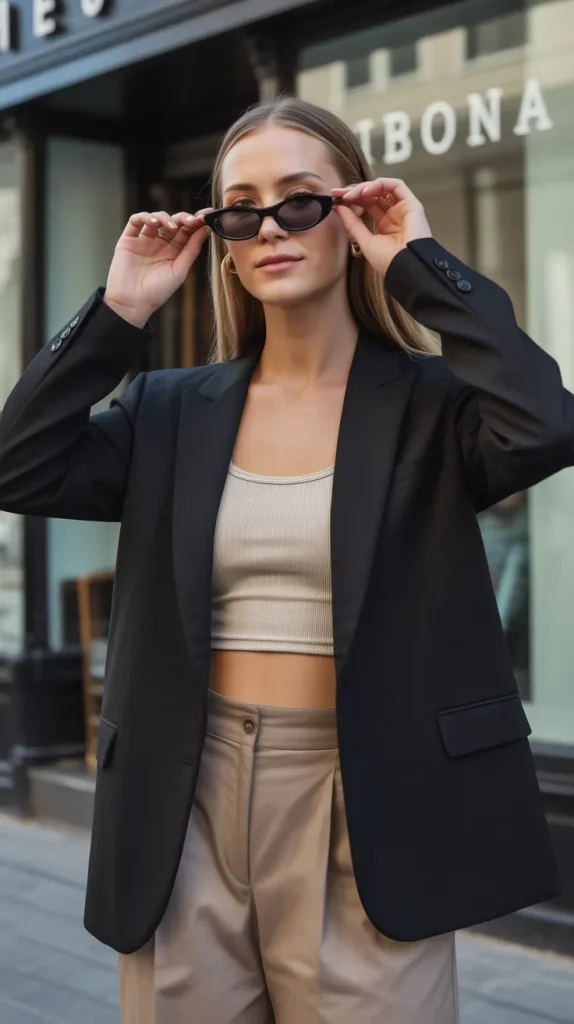 For a bold twist, pair a black blazer with a neutral crop top and high-waisted trousers. Itβs trendy mode inspo that balances chic with daring.