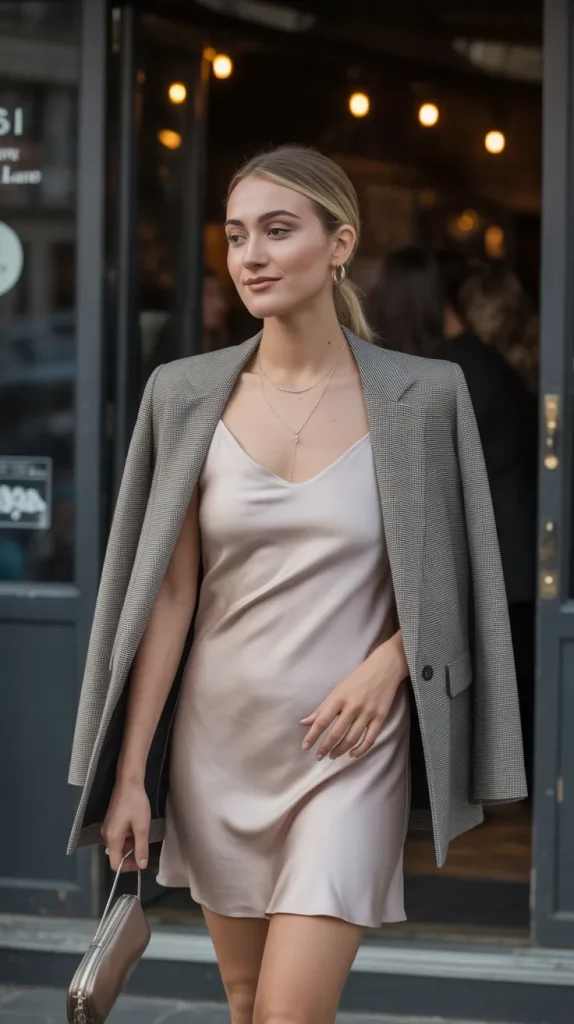 Layering a blazer over a silky slip dress instantly makes the outfit versatileβwear it to work with flats or switch to heels for evening chic.