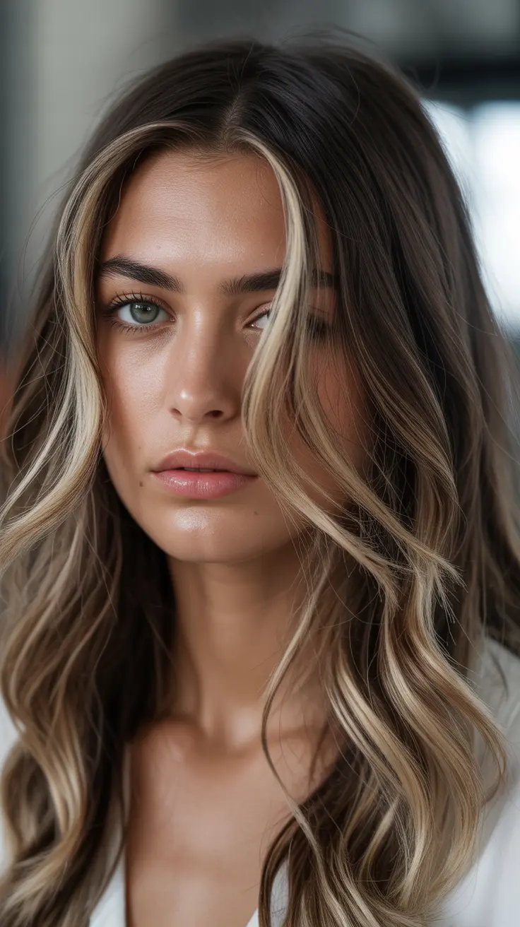 Long waves with blonde highlights on dark hair create a stunning look that’s both vibrant and sophisticated. The contrast between the deep, rich tones of dark hair and the bright, caramel blonde highlights adds a beautiful dimension. This style is perfect for anyone looking to refresh their hair without a complete color change.