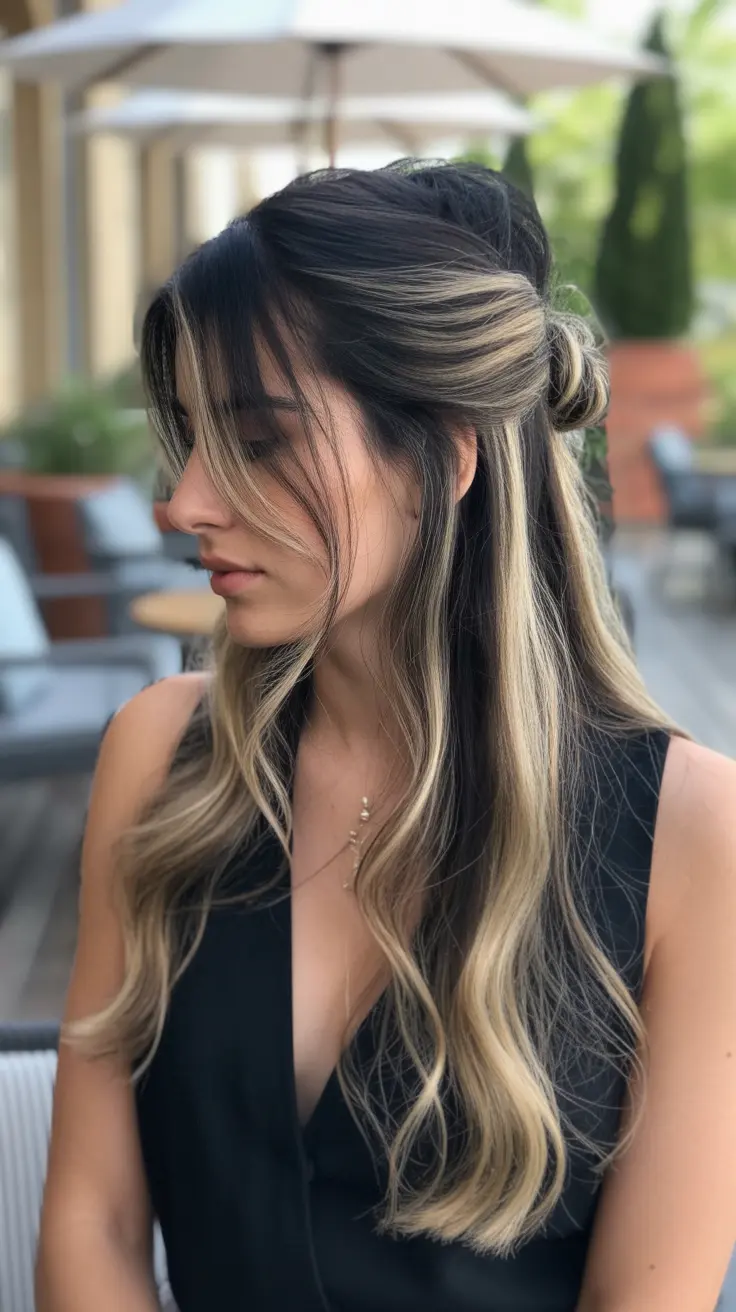 The half-up hairstyle is a fantastic way to showcase blonde highlights on dark hair. This look adds a playful touch while keeping the hair neatly styled. The contrast between the dark base and the caramel blonde highlights creates a stunning visual effect.