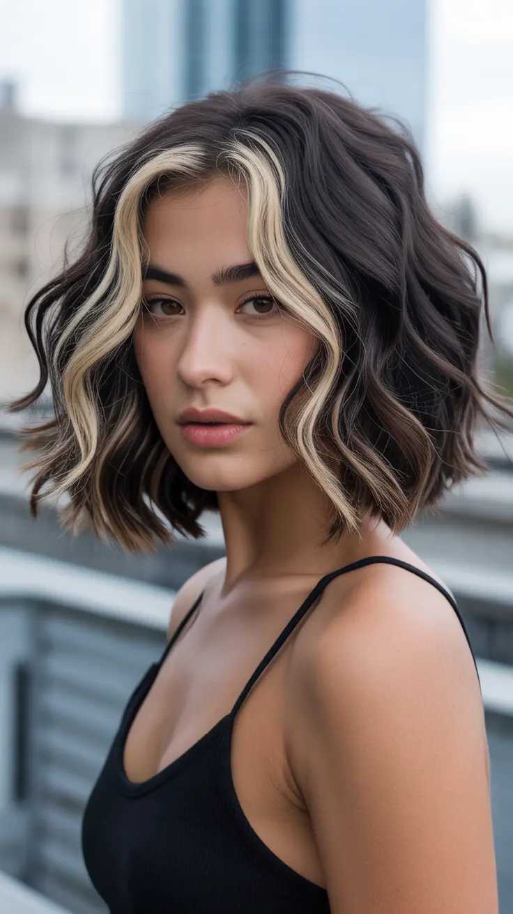 The wavy lob is a stunning hairstyle that perfectly showcases blonde highlights on dark hair. This look combines the richness of dark hair with the brightness of caramel blonde highlights, creating a beautiful contrast. The waves add movement and texture, making it a lively choice for any occasion.