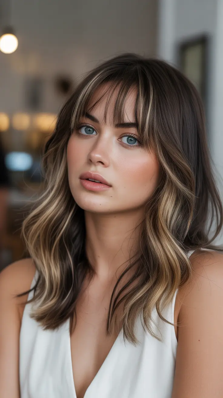 Feathered bangs are a stylish choice that can really enhance your look. When paired with blonde highlights on dark hair, they create a stunning contrast that draws attention to your face. The soft, layered texture of feathered bangs adds movement and dimension, making your hairstyle feel lively and fresh.