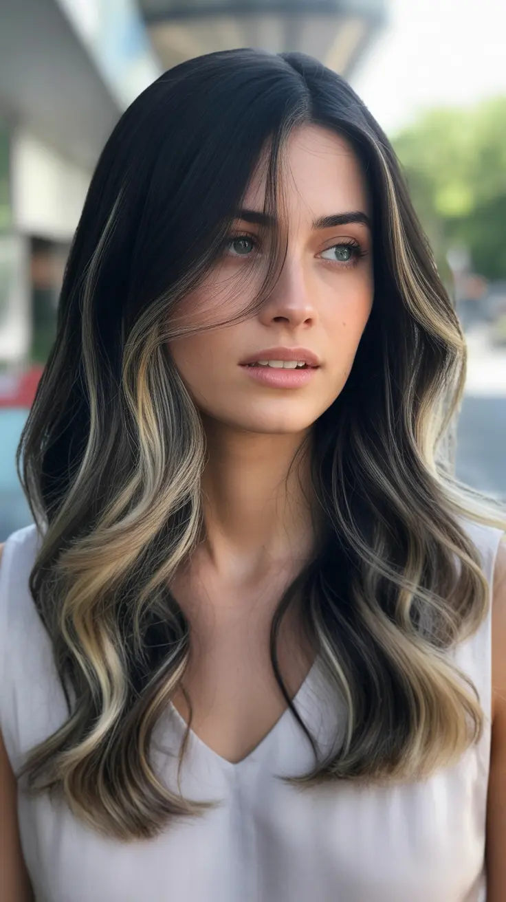Blonde highlights on dark hair can create a stunning contrast that really stands out. This look is perfect for anyone wanting to add some glow and dimension to their style. The side-swept layers in this image enhance the overall effect, making the highlights pop even more.
