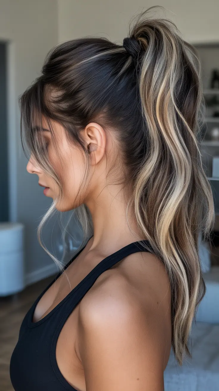 A high ponytail is a classic hairstyle that never goes out of style. When paired with blonde highlights on dark hair, it creates a striking contrast that adds depth and dimension. The sleekness of the ponytail showcases the highlights beautifully, making them pop against the darker base.