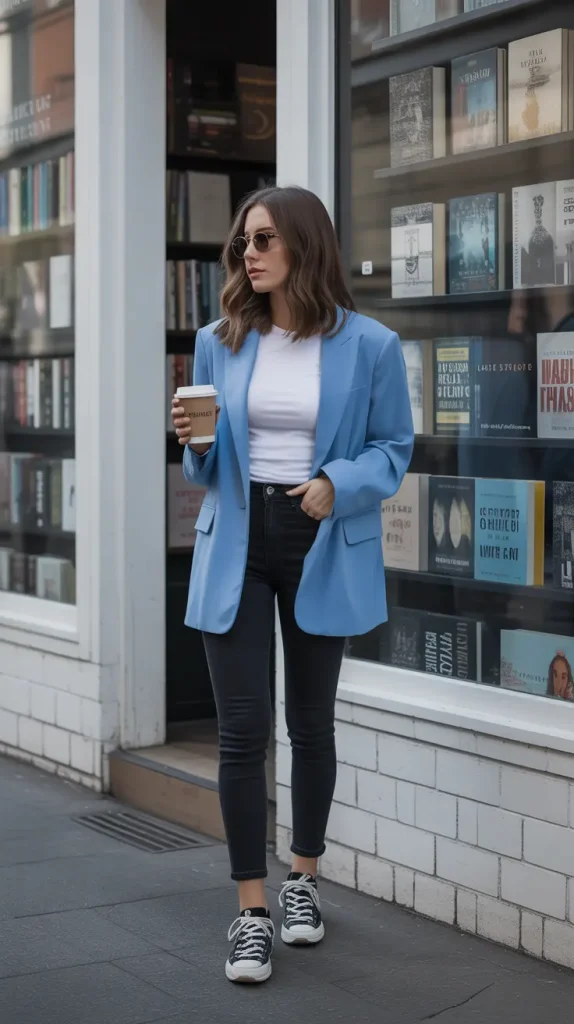 Bold meets casual here. A royal blue blazer with black skinny jeans and a tucked-in tee feels modern and edgy. Stiletto heels turn it from day to night in a snap. It’s one of those blue blazer outfits for women that fits rooftop lounges just as well as daytime errands. Don’t you love when an outfit does both?