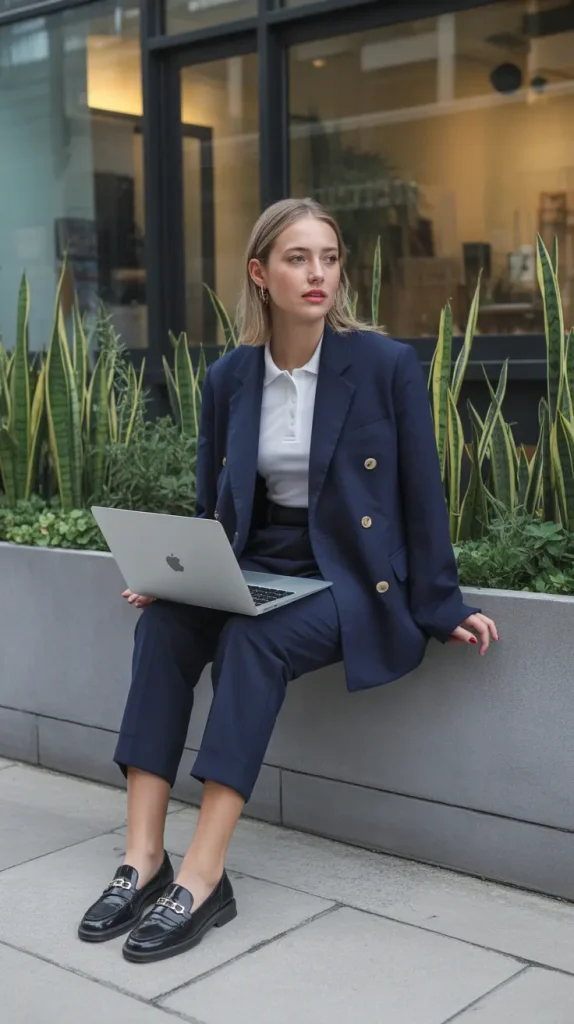 A navy blazer layered over a sleek polo adds preppy polish in the best way. Pair it with cropped trousers and loafers for a sharp but relaxed vibe. It’s ideal for casual co-working spaces or lunch meetings. This is the kind of business casual outfit that works when you want to feel smart but not overly formal. Honestly, sometimes polos just deserve a blazer moment.