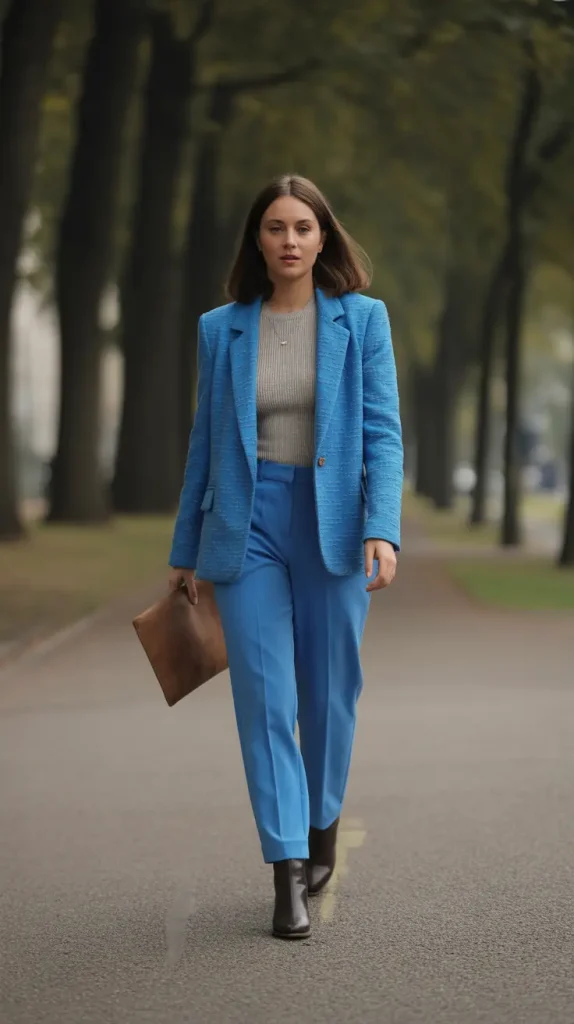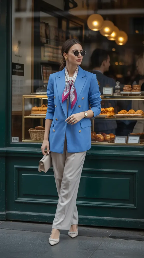 Sometimes the blazer is just the canvas. Pair a simple blue blazer with neutral pants, then add bold accessories a colorful scarf, metallic watch, pointed flats. The extras elevate everything. It’s an easy way to keep your wardrobe fresh without new clothes. Isn’t it wild how accessories can change the entire mood of an outfit? This is a perfect example.