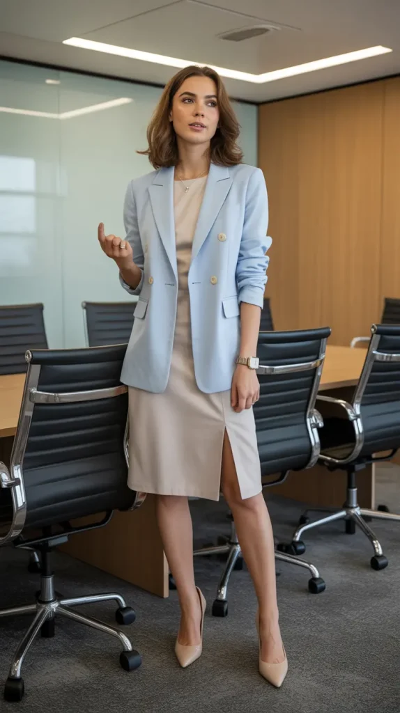 14. Light Blue Blazer with Neutral Dress