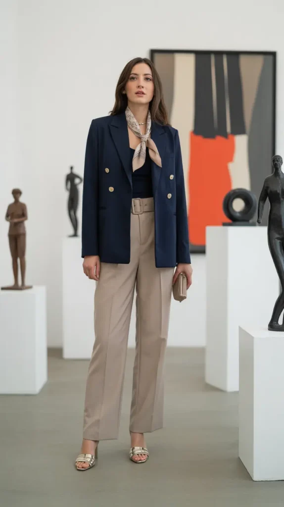 This look is about subtle statement-making. A navy blazer with belted beige trousers feels sleek but approachable. Add mules and a silk scarf, and you’re instantly gallery-ready. It’s elegant without being fussy. Honestly, this pairing is a reminder that accessories make all the difference.