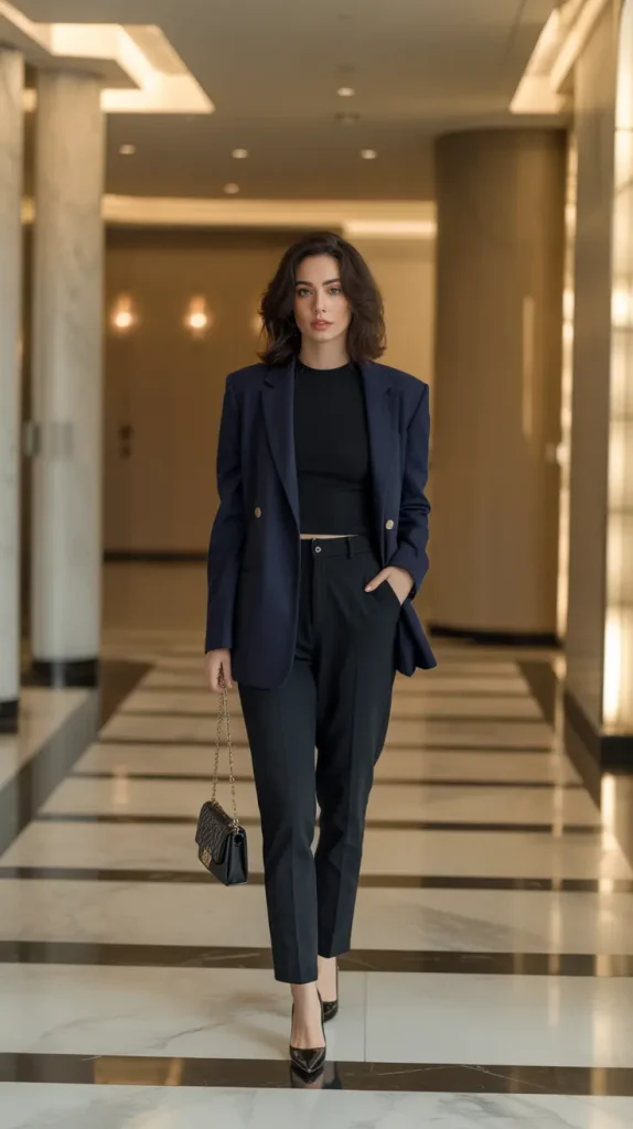 Nothing is more powerful than black layered with navy. A dark blue blazer over an all-black base feels sleek and commanding. Add pumps and a chain bag, and you’ve got an outfit that screams quiet confidence. It’s strong, bold, and totally timeless. Honestly, it’s the kind of look that never fails.