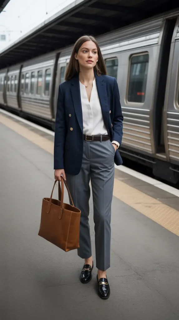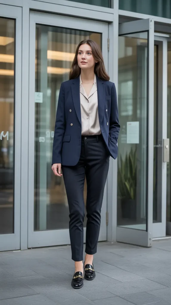 This is the epitome of office chic. A dark blue blazer paired with gray slim-fit trousers and a white blouse keeps things sharp without being predictable. Loafers finish the look with a touch of ease. It’s the kind of business casual outfit that works across industries polished but not intimidating. Ever noticed how gray and navy together always feel expensive? That’s why this combo wins.