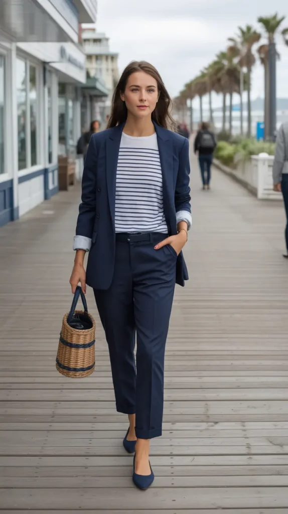 Stripes make everything more playful. A navy blazer layered over a blue-and-white striped tee instantly feels relaxed but sharp. Add tailored trousers and ballet flats for casual sophistication that works on or off the clock. It’s easy, classic, and perfect for a day that starts with errands and ends with drinks. Ever wish for a uniform that’s actually fun? IMO, this one’s it.