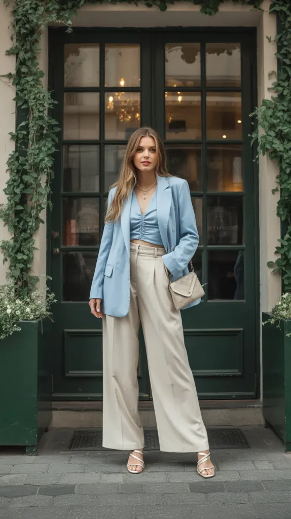 Soft colors can be powerful too. A baby blue blazer with cream wide-leg trousers creates a light, modern vibe. Pair it with strappy heels and you’ve got one of those classy work outfits that doubles for dinner. The wide-leg cut feels effortless, while the blazer sharpens the whole look. If you want comfort that still looks chic, this one nails it.
