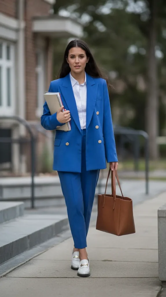 Bold color, sleek silhouette this look has it all. A royal blue blazer paired with a black pencil skirt and button-down blouse strikes the perfect balance between professional and stylish. Add pointed heels and you’re dinner-ready the second you leave the office. This outfit is proof that blue blazer outfits for women don’t have to play it safe. Want to turn heads without being “too much”? This is your move.