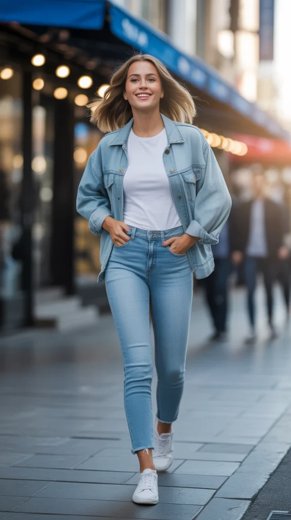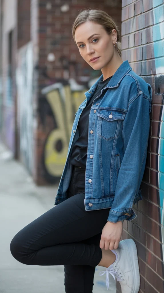 For an edgier take on a blue denim jacket outfit, pair it with a black t-shirt and fitted black pants. Add white sneakers for contrast, and you’ve got a cool city-ready look that’s effortlessly stylish.