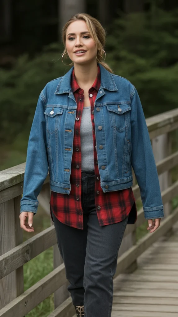 10. Blue Denim Jacket with Flannel Shirt