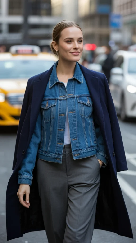 Layering a dark-wash denim jacket under a tailored wool coat is a smart way to add texture and warmth. Perfect for those transitional days when you want a mix of casual and polished.